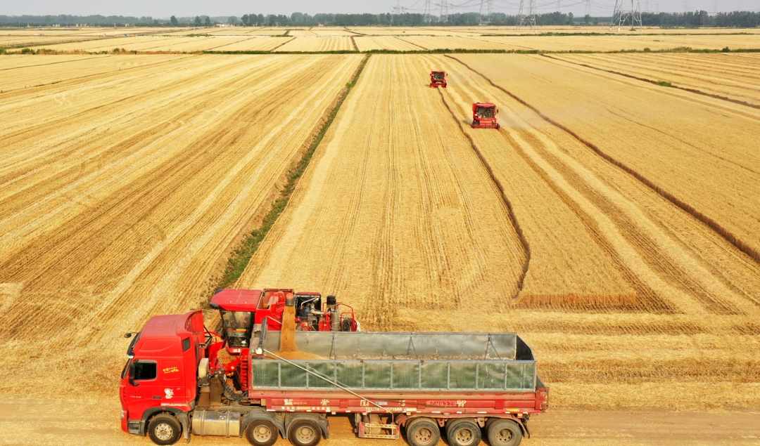 潘村湖农场小麦标准化收割作业(杨登红 摄)