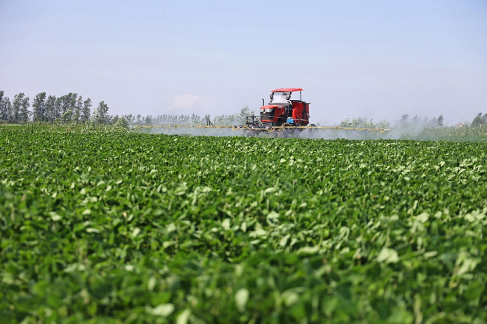 7月7日,在潘村湖农场公司第三农业分公司统一经营田内,农机手驾驶植保机正在进行大豆化除施药作业。陈凯 摄